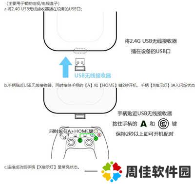 a、按住手柄【HOME】键2秒开机,指示灯进入闪烁状态;
