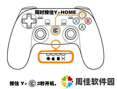 b、同时按住手柄的【Y】和【HOME】键2秒开机,【苹果指示灯】进入闪烁状态;