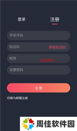 2、有账号密码直接登录即可,首次使用切换为“注册”,输入手机号、昵称以及密码。(注意:昵称里面不能有数字)