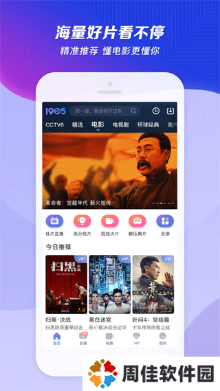 1905电影是一款可与CCTV6频道同步跟进更新的视频播放软件,以国内外的高评分电影、大片作为主题,每天向观众们整理最好看的电影,1905小编团队精准推荐,海量超人气大片看不停,总有一部电影能够打动你的心。24小时转播电影频道的电影播放单,365天永不打烊,并且承诺一年绝不会播放两部相同的电影,全网大片全部都能收入囊中。