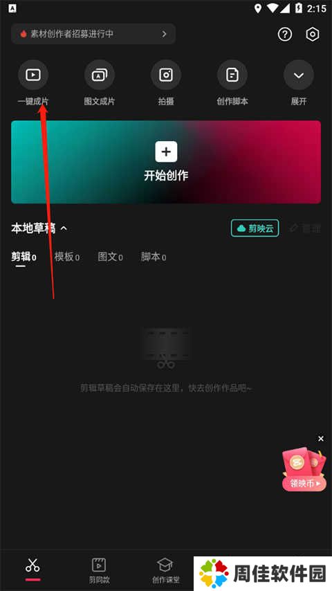 1、下载打开剪映安卓版后点击上方一键成片按钮。