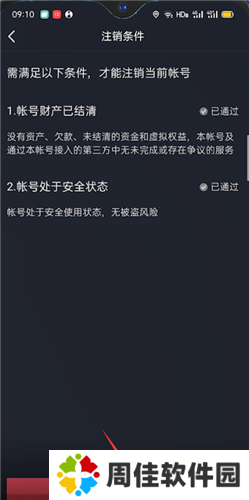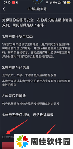 6、点击注销账号,查看是否满足注销条件,勾选我也阅读并同意抖音注销须知,点击下一步,