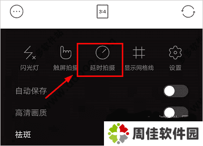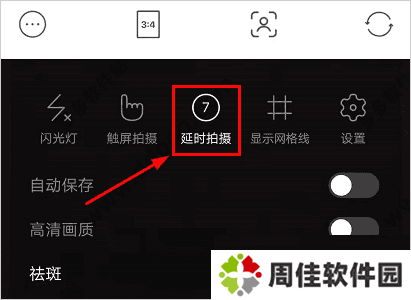 1、在相机左上角的设置功能界面可以看到”延时拍摄“功能,点击一下即可。