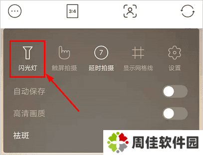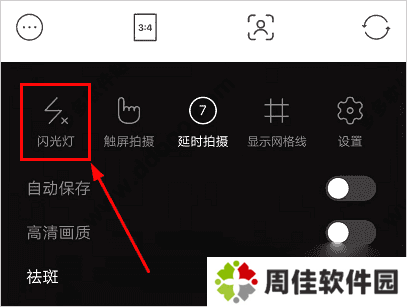 1、在相机左上角的设置功能可以看到”闪光灯“的功能选项,点击开启。