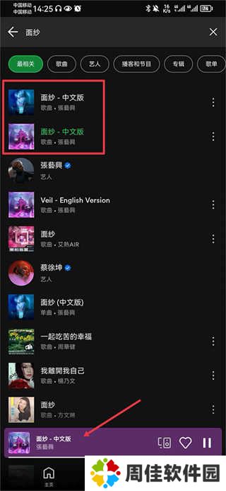 2、这里小编以面纱为例子进行搜索,搜索结果出来后点击你收听的歌曲,播放后点击下方的歌曲进入播放界面;