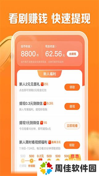 速看剧场手机版app优势速看剧场手机版app的整体操作还是比较轻松简单的,简洁流畅,支持滑动自由切换不同的短剧作品。此外,用户成功观看一定时长的短剧作品,都能领取一定的红包奖励。