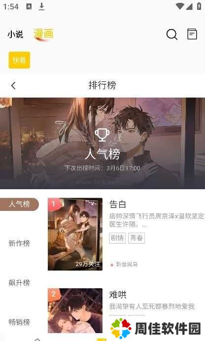 2、您可以在多个漫画网站之间切换来阅读漫画,有人气排行榜、新作排行榜、飙升排行榜、畅销排行榜。