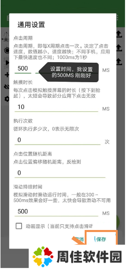9、选择第一个点击周期设置每次点击中间间隔时间,这个时间单位是毫秒,一秒等于1000毫秒,这里需要设置成500毫秒,就是半秒钟,时间太长太短都不行,500我设置时间对我的正好,每个人手机灵敏度不一样,你们也可以根据自己手机的反应速度来设置时间,多试几次找到适合自己的就行,点击位置随机偏移建议设置20防检测,设置完成后点击右下角保存。