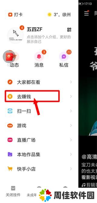 1、登录快手极速版后,点击【去赚钱】按钮。