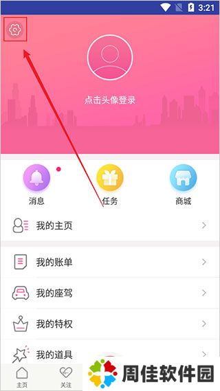 2、在“我的”页面,点击左上角“小齿轮”图标按钮。