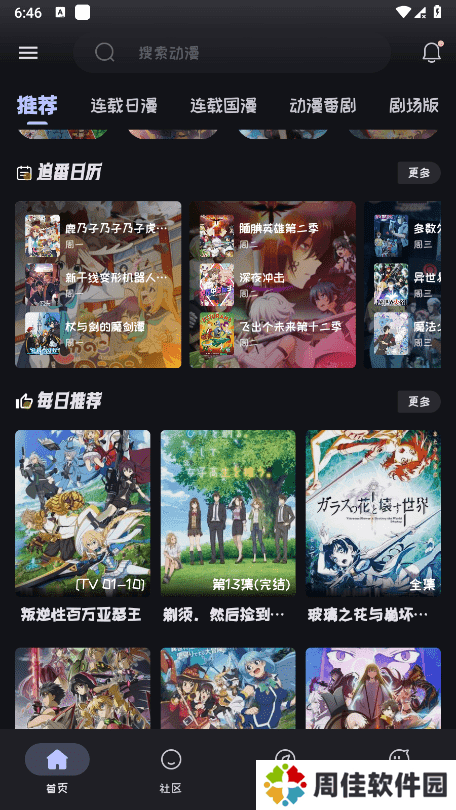 2、在首页,我们可以看到连载日漫、连载国漫、动漫番剧、剧场版等四大栏目;