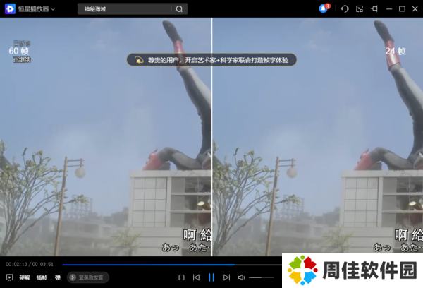 2、用恒星视频开始播放视频后,在播放器底部找到“插帧”按钮,点击后就可以开启插帧功能了,这时视频的帧数就比之前的有所增加,画面就会更加清晰流畅了。