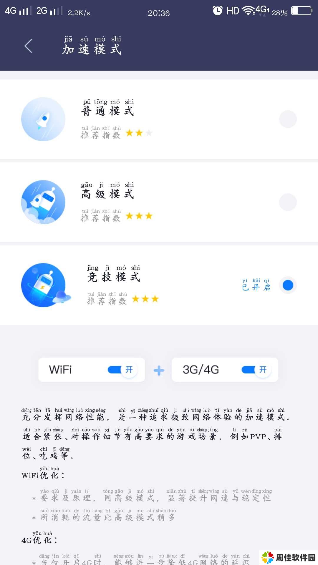 该模式采用[WiFi] 优化技术加速WiFi网络,[4G优化] 技术加速4G网络,可显著提高网络稳定性,减少卡顿。