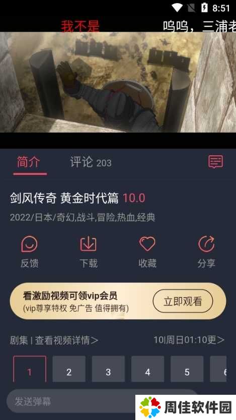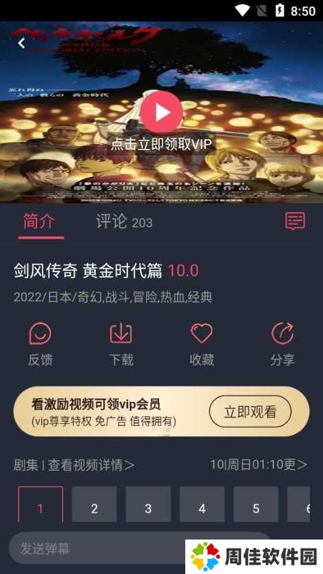 2、然后选择一个自己喜欢的番剧,比如我这里选择了剑风传奇。可以看到一个点击领取VIP的功能。