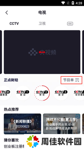 2、然后左右滑动CCTV频道,点击上方也可以切换到【卫视】,点击【节目单】查看当前频道的所有节目;
