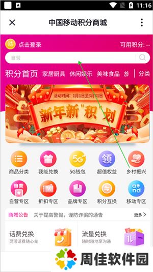 在打开的中国移动积分商城页面中,通过点击顶部搜索框