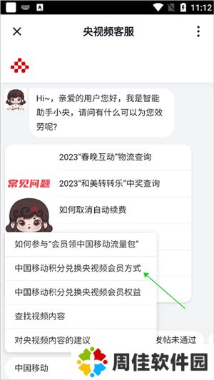 用户通过央视频【我的】-【用户反馈】,进入央视频客服页面中输入“中国移动”,在弹出的下拉选项中点击【中国移动积分兑换央视频会员方式】