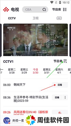 点击节目单右侧的图标(下图绿色箭头所指)可以在下方展现频道节目,可以对之前播放过的节目点击【回看】可对播放过的视频节目进行回看