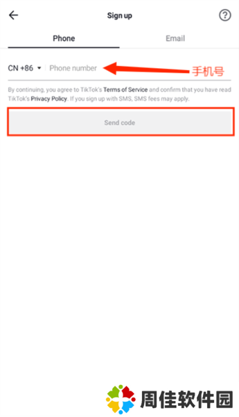 4、输入手机号码或者邮箱号,然后点击“Send code”注册。