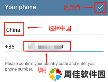 2、在选择国家处选择中国China,填写手机号码,最后点“√”进入下一步