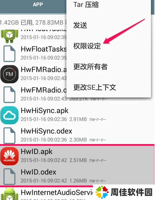 选中想要删除自带软件的两个文件以后点击右上角的选项,然后选择权限设定功能。
