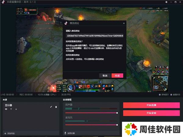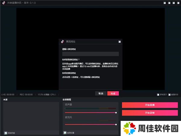 11、在弹出的推流地址窗口中输入你的抖音直播地址点击完成即可开始直播,这时候你可以最小化抖音直播伴侣开始直播了