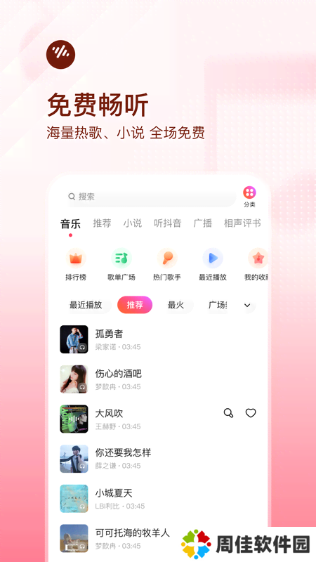 3、抖音推出的免费音乐播放器产品,内容超全,海量热歌、小说、相声评书全都有。