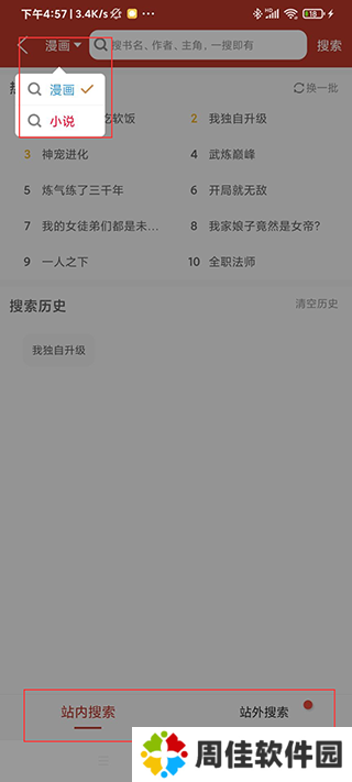 3、右上角是搜索,可以站内搜索、站外搜索,也可以分别搜索漫画和小说;