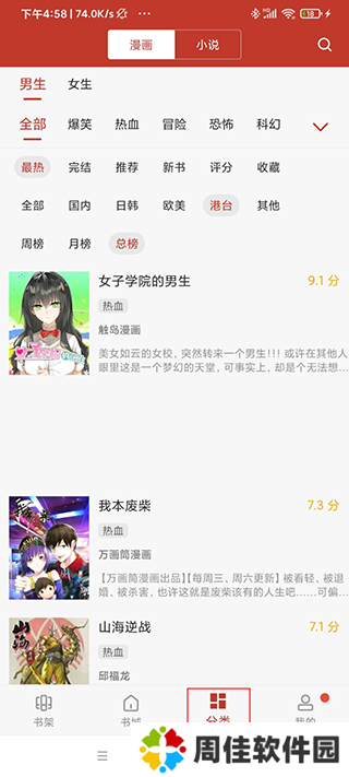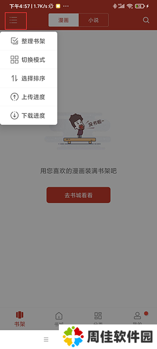 2、左上角是书架设置,可以对漫画和小说进行整理和排序;