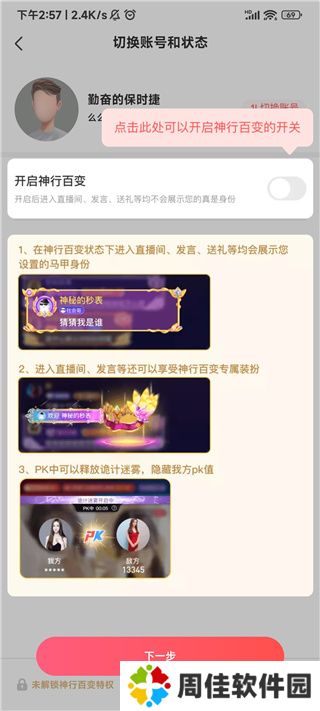 9、点击切换,开启以后进入直播间发言送礼都不会展示你的真实身份,还能享受专属装扮;