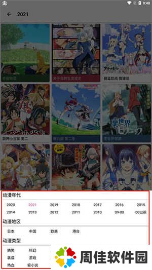 4、点开动漫分类就可以筛选年代、地区、类型来发现符合自己口味的动漫;