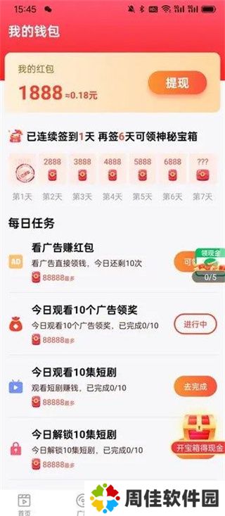 极速刷刷app还为用户提供了丰厚的刷剧福利,每天都有大量的短剧观看任务。成功观看一定时长的短剧,都将会领取一个的红包奖励,且这些红包都能提现哦!