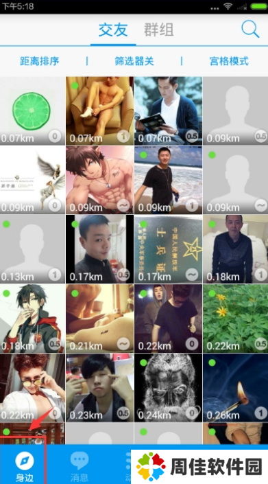 2、登陆成功后即进入到主界面,也就是身边页面,可以查看给你推荐的离你最近的基友信息,同时你可以根据距离排序、筛选器关、宫格模式进行设置。