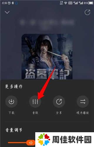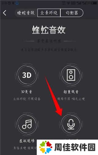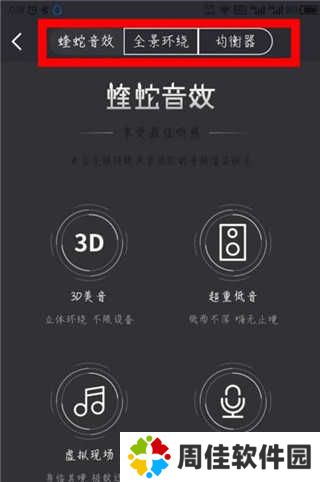 4、然后能看到顶部的菜单选项,可以选择蝰蛇音效全景环绕和均衡器。如图所示