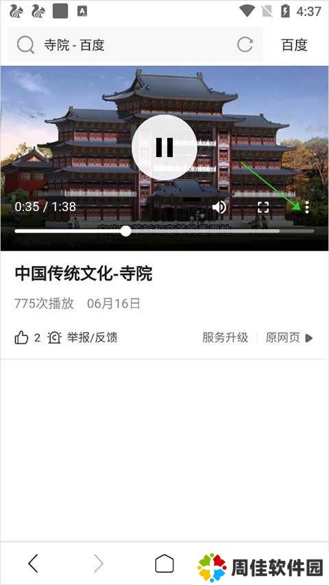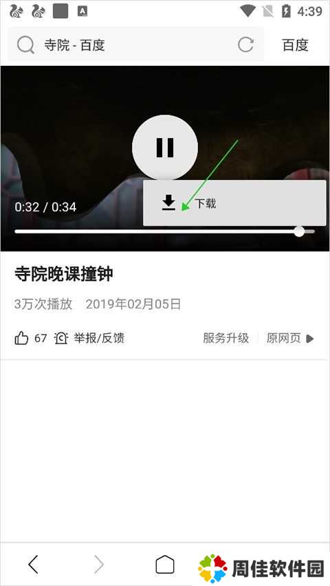 用户在视频播放页面中点击播放画面,然后在播放画面底部右侧会弹出扩展功能按钮(下图绿色箭头所指)