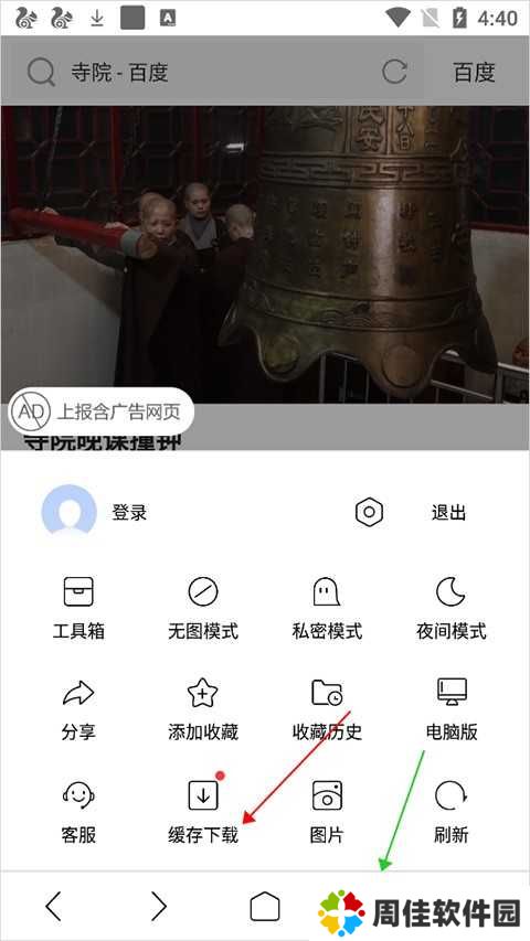 下载内容可以点击页面底部的扩展功能按钮(下图绿色箭头所指),然后再点击【缓存下载】