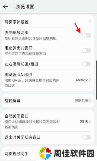 4、进入浏览设置,找到下方的强制缩放网页,点击右侧的按钮开启此功能