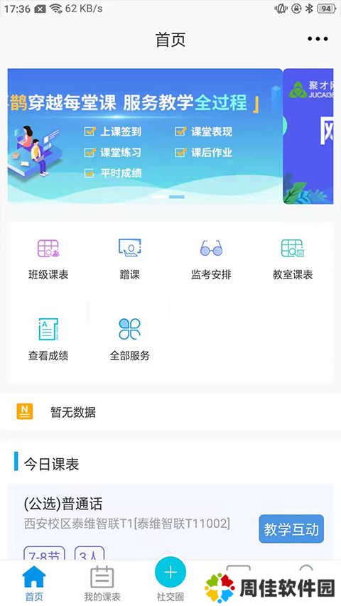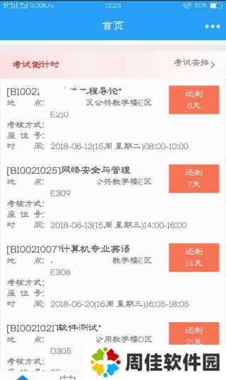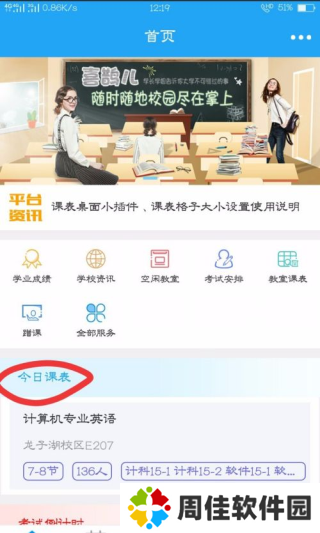 登录成功后可以在首页看到当前的课表、学习成绩、学校资讯、考试安排、空闲教室等各个栏目。如果您处在即将考试阶段,那么你将可以看到考试安排和倒计时,时刻提醒我们。