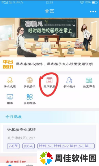 平时学校和学院里发的各种通知也都能在首页看到,方便学生接收学校信息。如果在考试之前想要复习功课,那么您可以点击“空闲教室”按钮,进入后查看哪个教室在什么时间是空闲的,然后你就可以去上自习了。