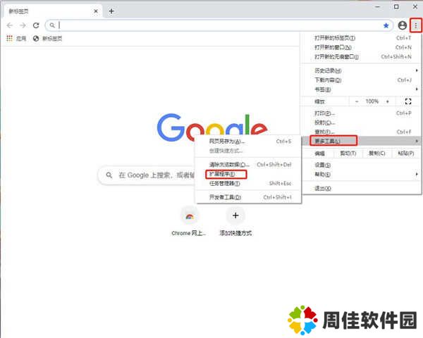 1、首先用户点击谷歌浏览器右上角的自定义及控制按钮,在下拉框中选择工具选项,然后点击扩展程序来启动Chrome浏览器的扩展管理器页面