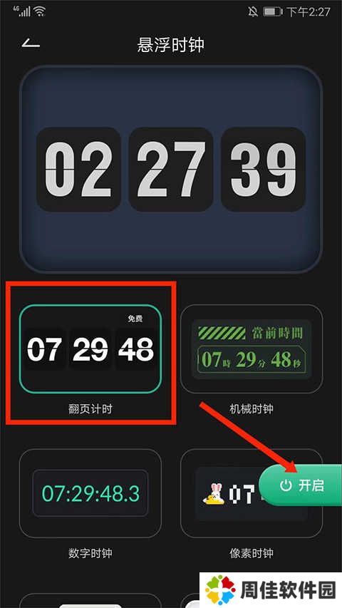 3、进入【悬浮时钟】界面,可看到【翻页计时】、【机械时钟】、【数字时钟】、【像素时钟】等风格的时钟,这里以【翻页时钟】为例,选择【开启】选项,