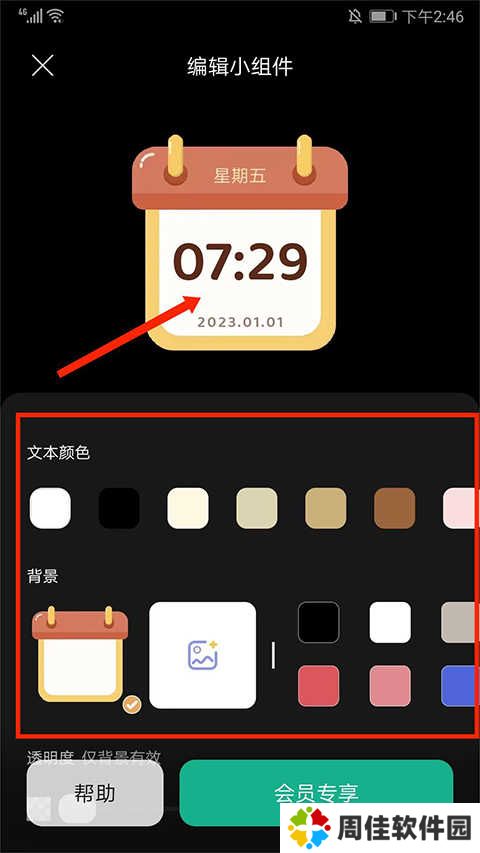 4、进入【编辑小组件】界面,用户在这里可以调时间和日期了,还可以自定义文本颜色、背景透明度。