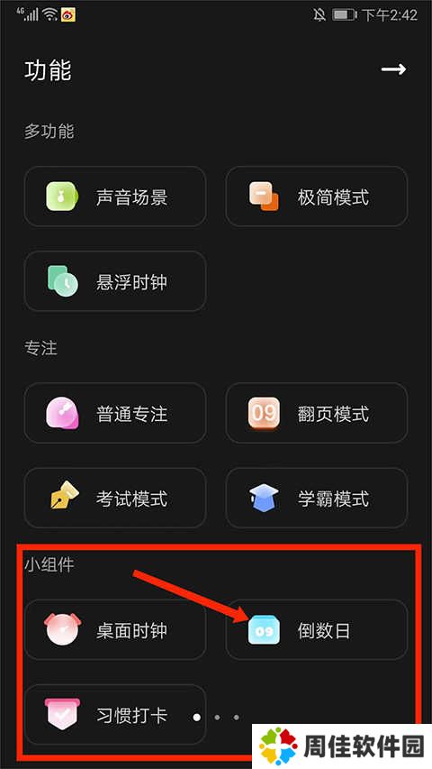 2、在功能界面,可看到小组件分栏,包括【桌面时钟】、【倒数日】和【习惯打开】,用户可根据需求选择相应的类型,这里以【倒数日】为例,