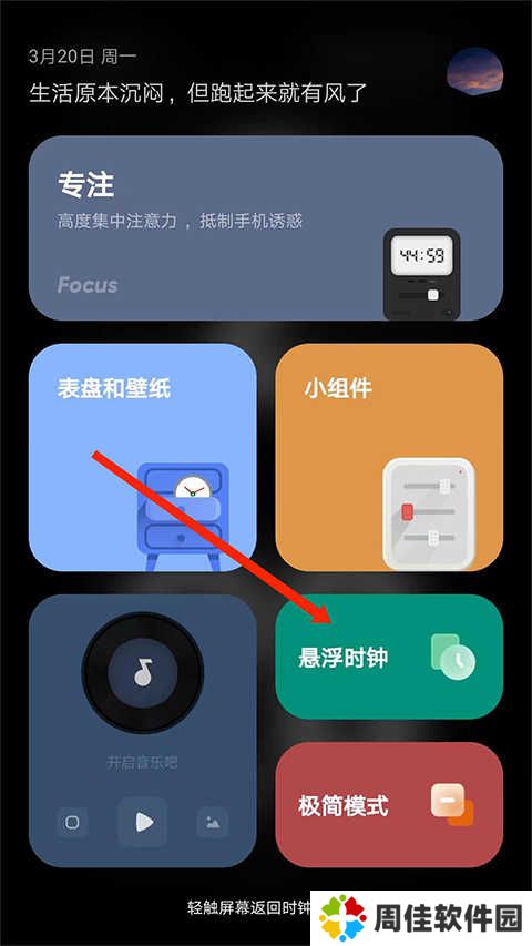 2、进入新界面,包括【专注】、【表盘和壁纸】、【小组件】、【悬浮时钟】、【极简模式】等功能选项,选择【悬浮时钟】选项,