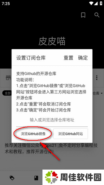 “设置订阅仓库”点击左边的“浏览GitHub镜像”,这个可以直接打开;右边的“浏览GitHub网站”需要科学上网工具才能打开;