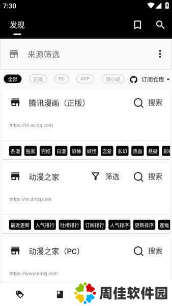等待订阅成功,再看“发现”里面就会出现很多漫画平台了,比如腾讯漫画、动漫之家、布卡漫画、漫漫漫画、可米酷等;