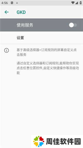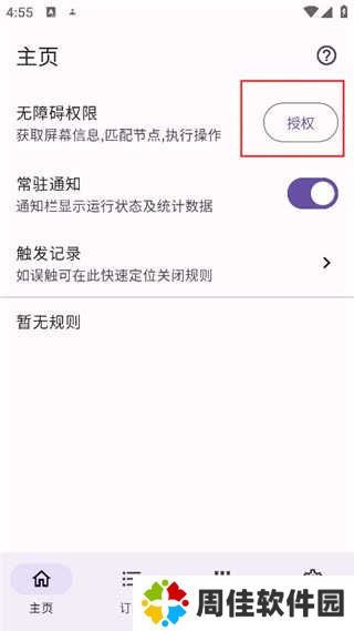 1、下载GKD APP,安装后打开软件,在主页依次授权无障碍权限以及悬浮窗权限,默认自动开启服务