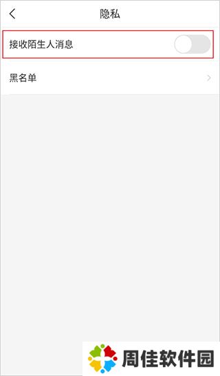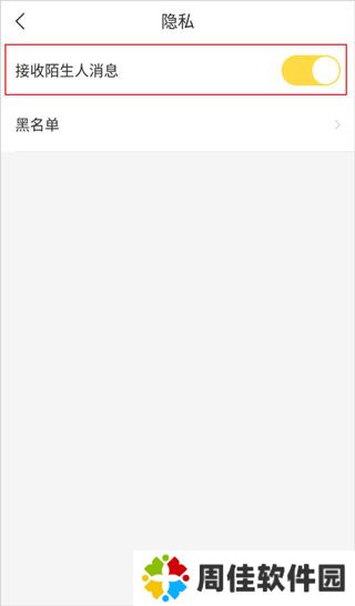 4、隐私设置界面点击“接收陌生人消息”后面的圆点。
