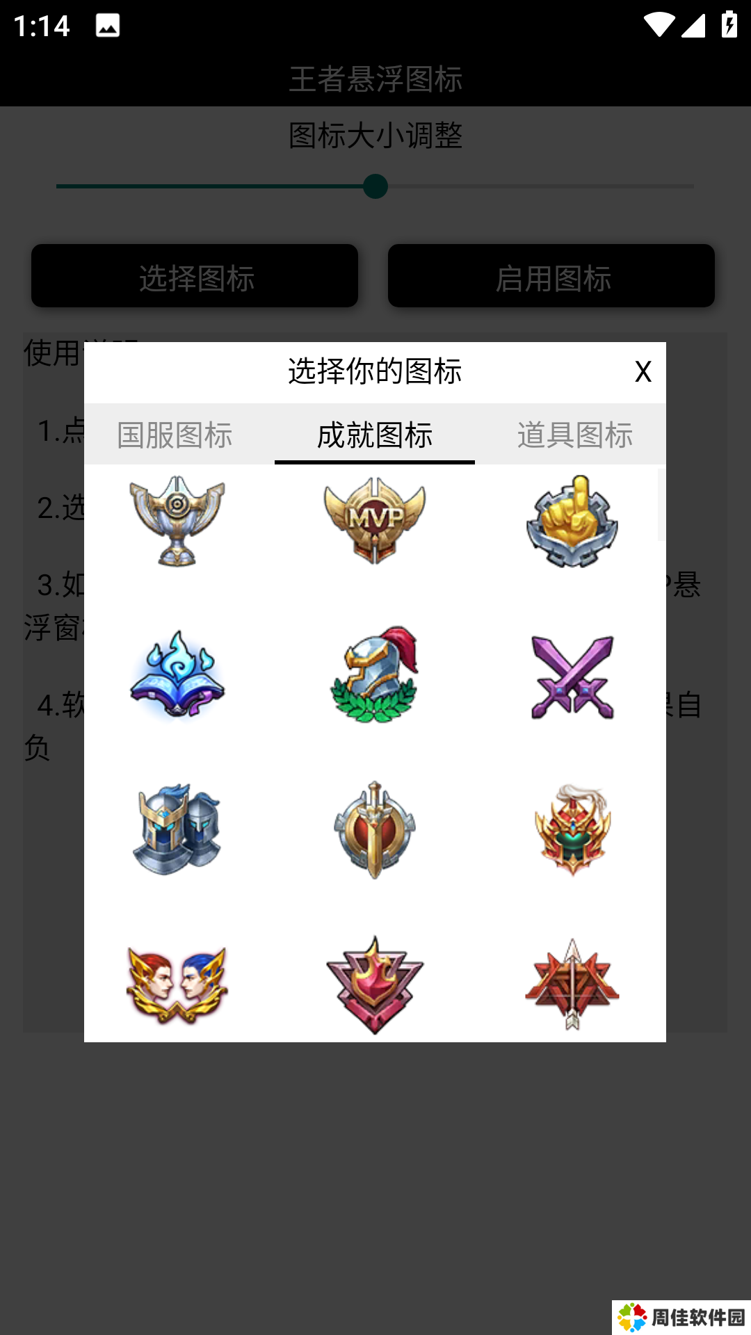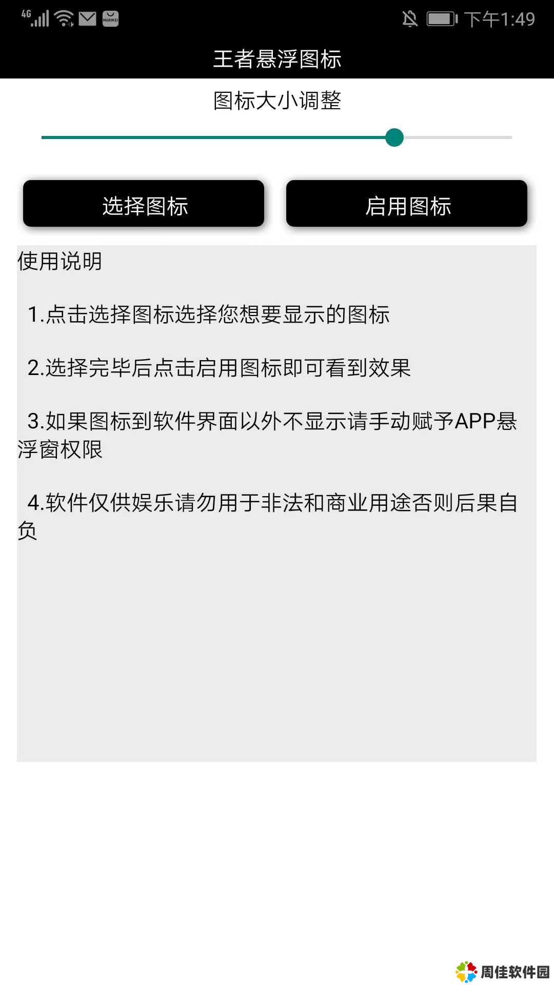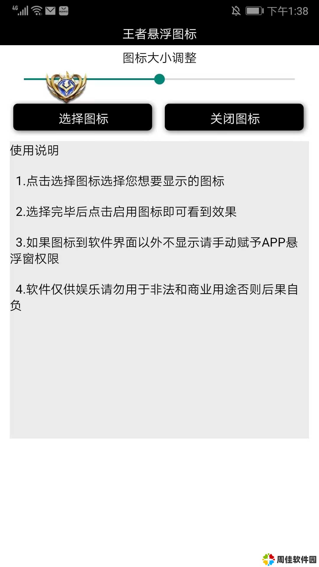 进入王者悬浮图标aapp首页,有选择图标和启动图标两个按钮