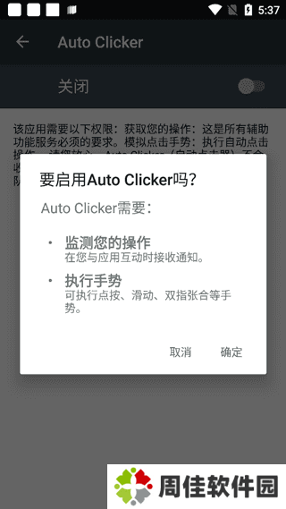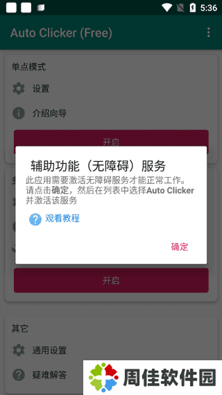 1、打开在本站下载的Auto Clicker自动点击器,系统会提示开启(无障碍)服务,这里我们点击确定;